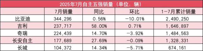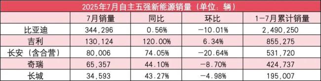 而自主5强的7月份的市场表现,基本与整体市场走向相符,表现都中规中矩。7月份,5家销量均保持了同比的增长,而4家出现环比下滑,仅吉利保持环比微增。从排名来看,5家排名保持了6月份的次序。其中,比亚迪依旧以34万辆+的成绩稳居第一;吉利和奇瑞销量“咬”得很紧,分别位列第二、第三;长安自主依然未超20万,排在第四;长城则依旧排在5家中的末端。
