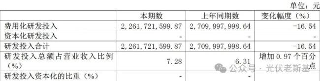 在研发方面,1-6月,天合光能研发投入为22.62亿元,较上年同期下降了16.54%。虽然投入总额减少,但由于营收下滑,其研发投入占营收的比重反而提升了0.97个百分点至7.28%。