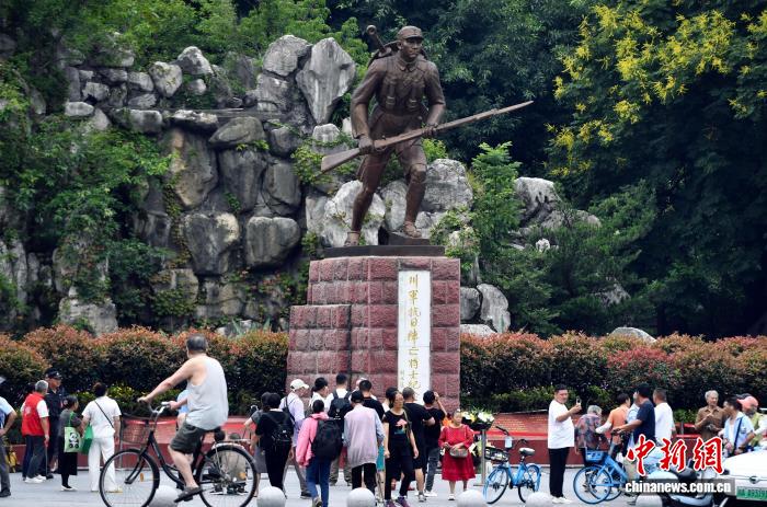 9月3日,在成都市人民公园川军抗日阵亡将士纪念碑前,市民和游人驻足瞻仰献花。图为民众在纪念碑前驻足瞻仰。中新社记者 王磊 摄