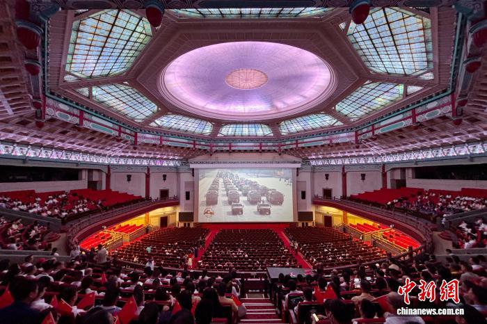 为纪念中国人民抗日战争暨世界反法西斯战争胜利80周年,“铭记历史,传承薪火”千人观看阅兵直播活动当天在广州举行。其中,来自美国、英国、新西兰、马来西亚等25个国家的青年侨领、归侨代表等60人在中山纪念堂与各行业代表、学生代表等1000余人共同观看直播。