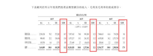 海辰储能超过六成的收入是由储能电池贡献的。尽管2024年整体毛利率升至17.9%,但公司核心产品储能电池的毛利率却下滑至仅9%。