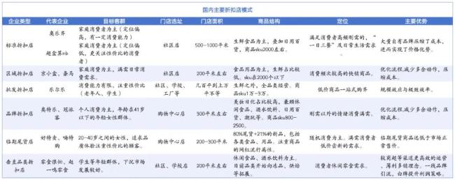 值得关注的是,虽然同为折扣店,经营遵循为消费者持续提供低价商品的准则,但企业发展模式差异显著。目前,在商品结构、客群定位、门店模型、盈利模式等诸多方面都能够看到不同。具体来看,涉及六类企业。