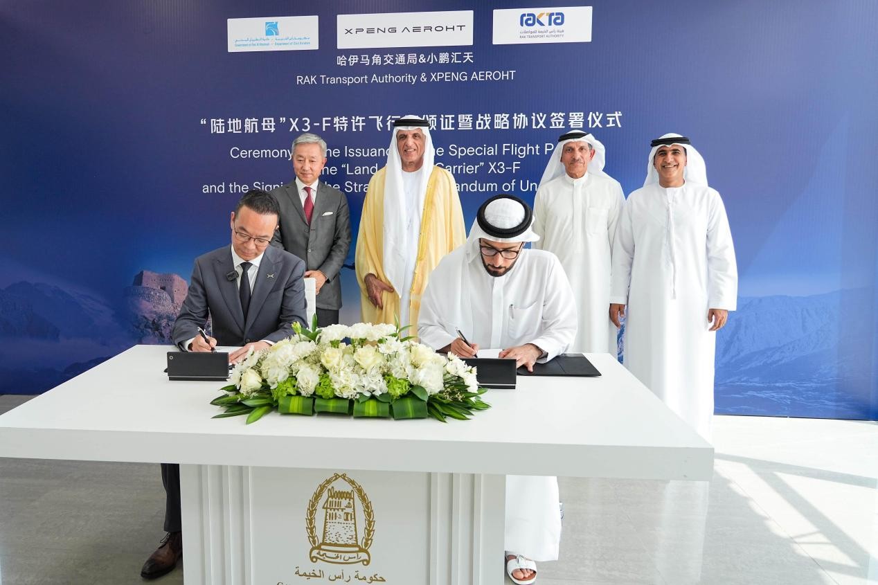 仪式上,哈伊马角交通局与小鹏汇天签署战略合作协议,双方将围绕飞行汽车试飞认证、场景应用等领域展开深度合作。根据协议,小鹏汇天将依托阿联酋的前沿政策与地理优势,推进陆地航母及汇天后续开发的航空产品项目在当地的政府交通出行、飞行体验、旅游观光、应急救援等场景的应用探索,双方共同打造具有示范效应的应用案例,提升哈伊马角酋长国在未来交通领域的国际影响力。