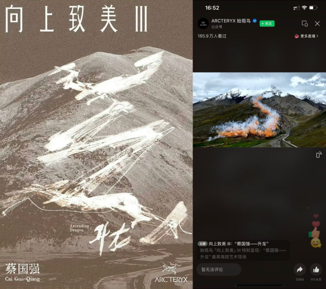 始祖鸟与蔡国强联合在喜马拉雅山脉点燃大型烟花“升龙”。山脊即龙脉,作品与自然结合,呼应在地文化中“龙象征吉祥与祈福”的寓意;“升龙”烟花的飞升姿态不仅体现了艺术家对天地、宇宙的追问,也传递着喜马拉雅深处世代相承的“生生不息”的向上精神。