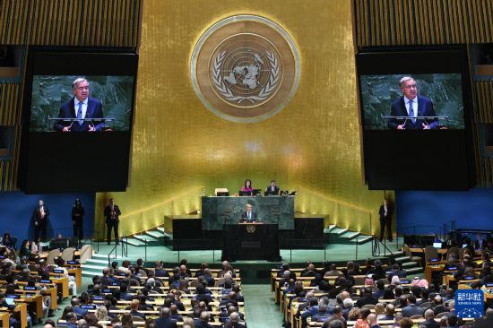 9月23日,在位于纽约的联合国总部,联合国秘书长古特雷斯在第80届联合国大会一般性辩论开幕式上致辞。新华社记者李睿摄