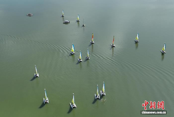9月27日,众多帆船在青山湖启航。当日,2025中国家庭帆船赛·杭州站在浙江杭州临安青山湖拉开帷幕,来自北京、上海、武汉等10个城市的40组家庭近百名选手在绿水青山间扬帆。(无人机照片)中新社记者 王刚 摄