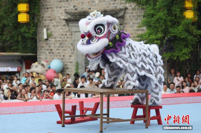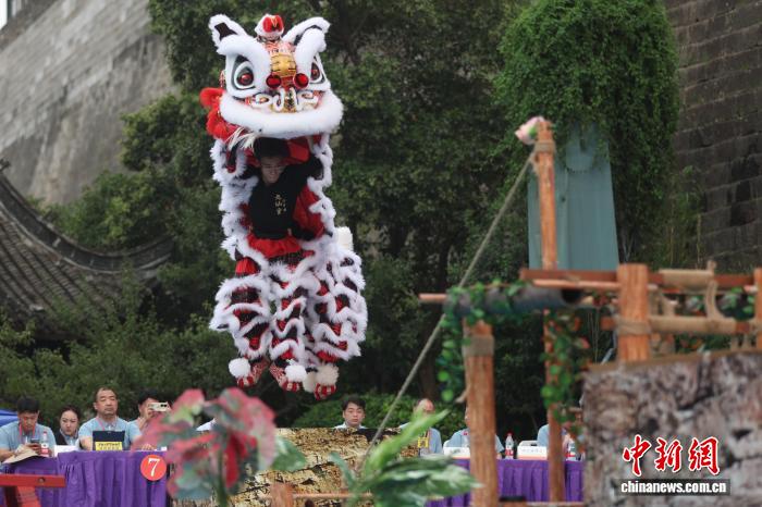 9月27日,在江苏南京举行的2025年世界华人狮王争霸赛传统南狮项目的比赛中,来自中国、新加坡、南非、美国等国家的参赛队伍轮番登台展绝活。图为深圳市宝安区西乡蚝业黄连胜醒狮团的成员在比赛中。中新社记者 泱波 摄