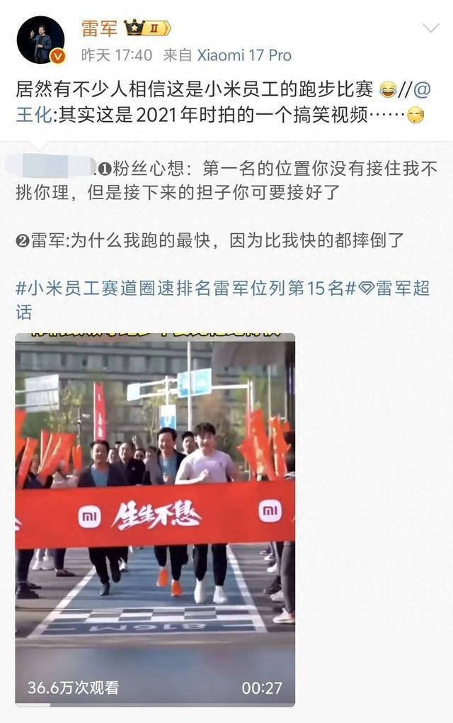 小米公关总经理王化对此进行了澄清,表示这其实是2021年拍摄的一段搞笑视频。雷军也转发了相关微博,表示有不少人误以为这是真实的跑步比赛。