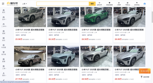 记者从多家二手车平台查询发现,目前行驶百公里以内的小米YU7准新车,挂牌价普遍较新车价格高出约1万元。其中,圈内流通的最低报价为25.98万元,虽较官方指导价仍高出约4000元,但相比刚上市时的溢价幅度已明显收窄。