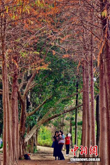 11月24日,市民和游客在变红的水杉林里游玩。初冬时节,福建福州乌龙江湿地公园美景引游人。中新社记者 王东明 摄
