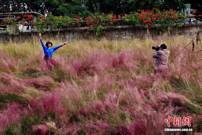 11月24日,游客在粉黛乱子草花丛中留影。初冬时节,福建福州乌龙江湿地公园美景引游人。中新社记者 王东明 摄