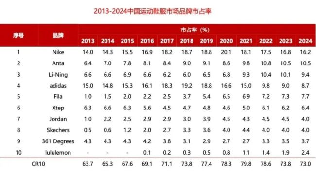 根据欧睿数据,2024年耐克在中国的市占率为16.2%。虽然仍然保持了第一位置,但比2021年下降了将近2%。