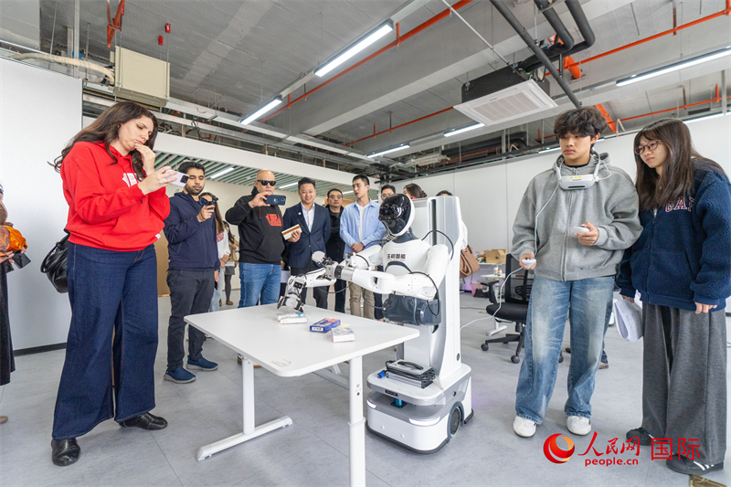 外媒记者在深圳玉树具身机器人智创中心观看机器人训练。人民网记者 许峥摄