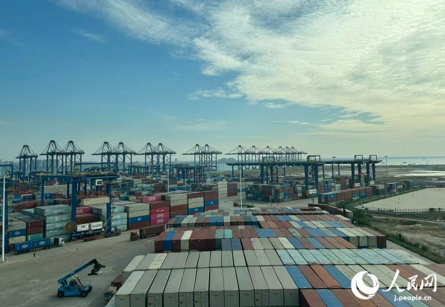 洋浦国际集装箱码头堆放的集装箱。人民网 玄番登史江摄