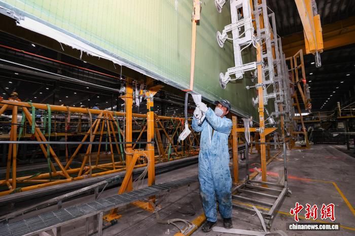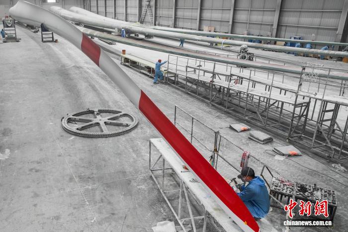 12月11日,工人在生产风电叶片。(无人机照片)记者 瞿宏伦 摄