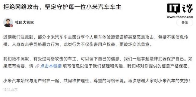 9月26日,小米官方在小米汽车社区发布了一篇文章《拒绝网络攻击,坚定守护每一位小米汽车车主》,呼吁受到网络攻击的车主留下信息,共同使用法律手段保护自己。