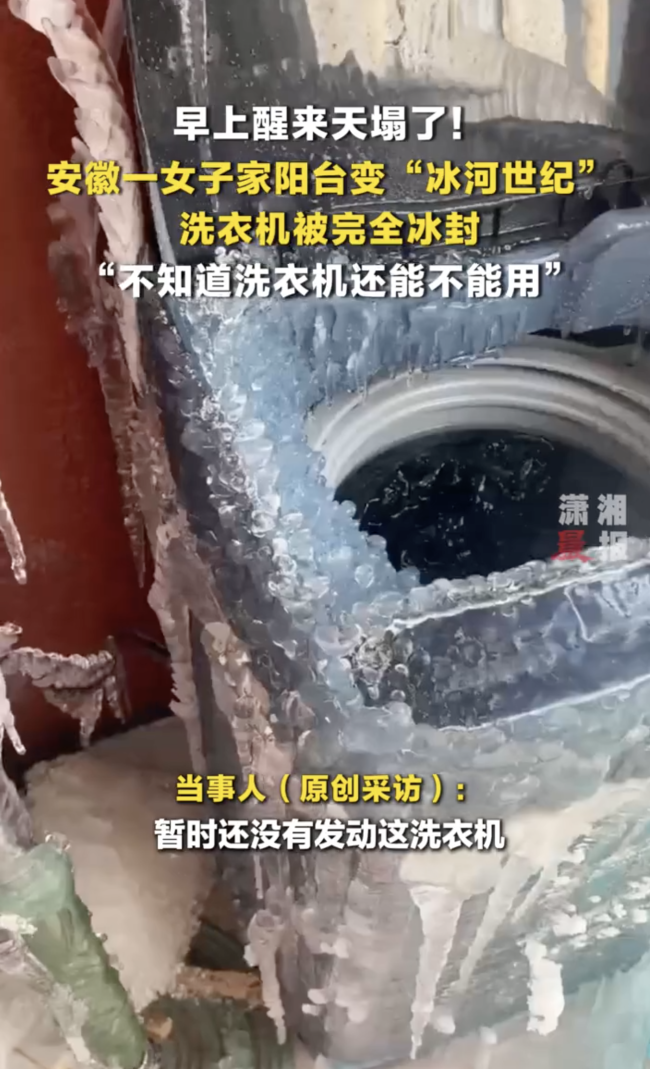 一觉醒来连洗衣机都被冰冻上了 寒潮下的南方困境。1月下旬,安徽遭遇一股强冷空气侵袭,气温降至零下11至12℃,打破了当地多年同期低温纪录。蚌埠一位女士家的阳台水管冻裂,渗出的水流在夜间悄然蔓延,最终将洗衣机完全冰封,机身与冰层融为一体。女子发现时,冰面已凝结得坚硬厚实,她担忧地表示:“水管裂了,不知道这洗衣机还能不能用。”