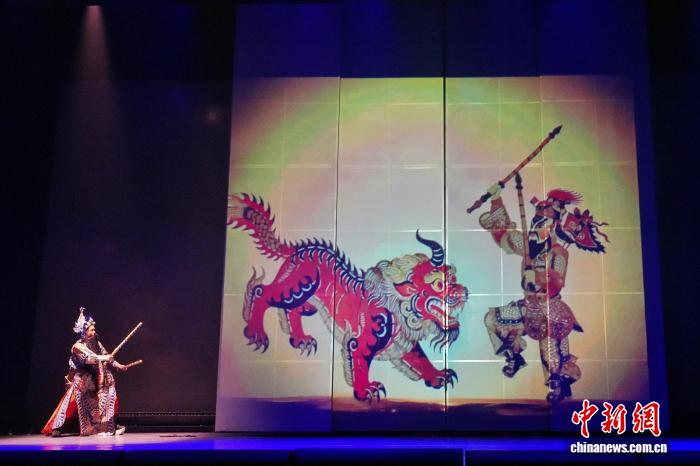 2月12日,非遗奇幻音乐戏剧《夏小正·奇幻年》在长沙首演。剧目源自古老农事历书《夏小正》,将皮影、剪纸、年画等非遗与光影相融,为少年儿童讲述充满年味的中国新春故事。图为演员与皮影互动演出。中新社记者 杨华峰 摄
