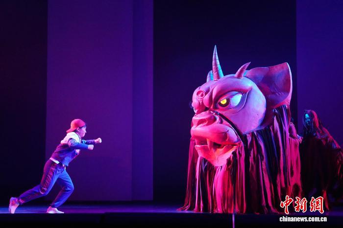 2月12日,非遗奇幻音乐戏剧《夏小正·奇幻年》在长沙首演。剧目源自古老农事历书《夏小正》,将皮影、剪纸、年画等非遗与光影相融,为少年儿童讲述充满年味的中国新春故事。图为演员与怪兽装置“年”同台演出。中新社记者 杨华峰 摄