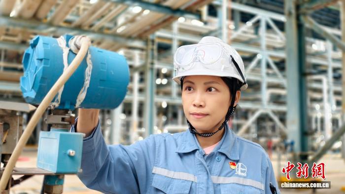 阮阳越在装置现场核对仪表数据。张鹏 摄