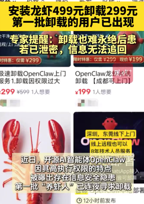 近日,开源AI智能体“小龙虾”OpenClaw持续火爆。因其高执行权限的特点,被曝出存在信息安全隐患。于是,“卸载龙虾”又成了AI新手的刚需,在电商平台上有人推出299元“上门卸载OpenClaw”的服务,号称可以“0残留”“永绝后患”,事实真的如此吗?、