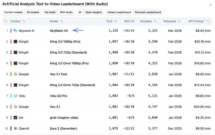 SkyReels V4登上Artificial Analysis榜单全球第一