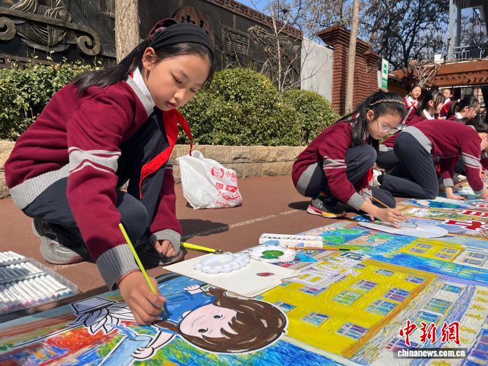 孩子们正在创作长达8米的“爱水节水”绘画作品。中新网记者 范丽芳 摄
