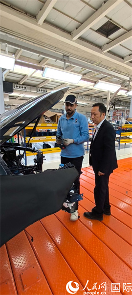 捷途埃及KD国家经理张铁军与当地工人在一起。人民网记者 黄培昭摄