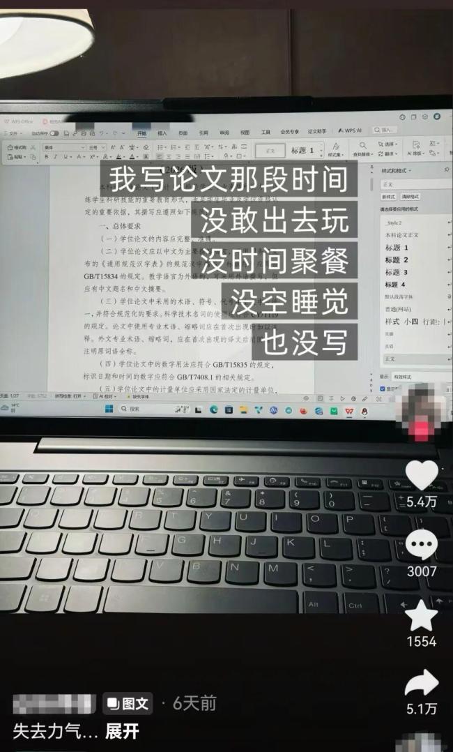 近日,有网友在社交平台分享了自己写论文的状态,短短几句话引起了众多大学生的共鸣。“完全!是!我!”“你知道我现在顶着多大的压力在玩吗……”面对步步紧逼的截止日期,有的网友展现出极强的抗压能力,但也有人表示,在写论文时除了写论文可以想做任何事,比如烙饼、熬酱、打扫卫生,甚至给草莓去黑头。