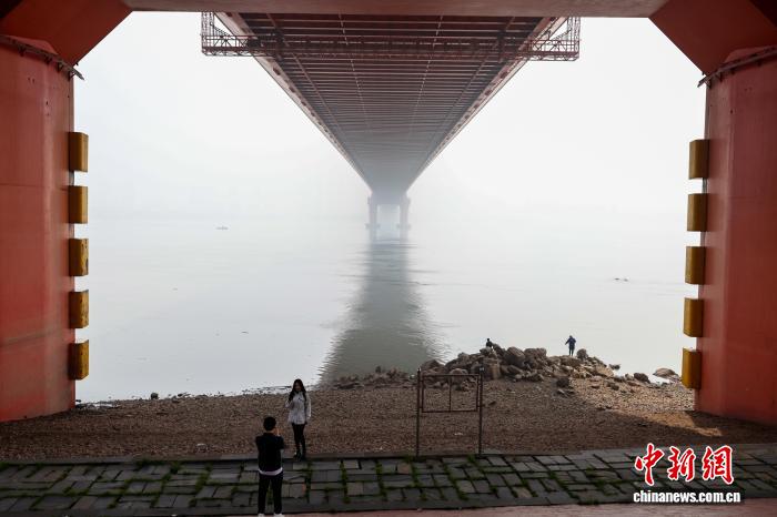 图为市民在鹦鹉洲大桥下拍照,远处的桥墩被雾气笼罩。中新社记者 张畅 摄