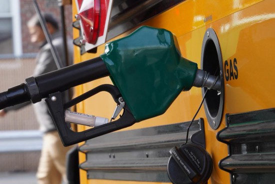 3月31日,一辆校车在美国纽约的加油站加油。新华社记者张凤国摄