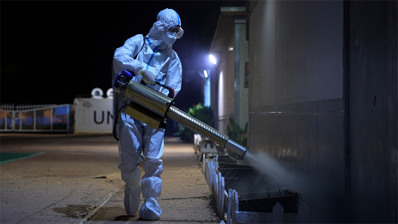 中国第六批赴阿卜耶伊维和直升机分队定期对营区进行病毒消杀,防治疫情。黄浩摄