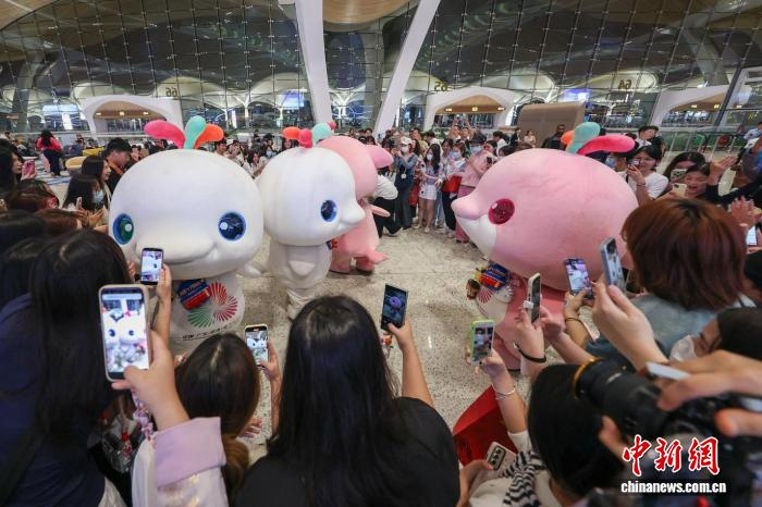 3月20日,白云机场T3航站楼,“大湾鸡”走秀引观众围观。