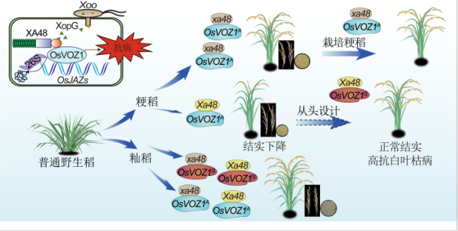 研究团队对数千份水稻资源进行大规模筛选,利用能克服传统抗病基因Xa21的毒性菌株,在籼稻品种“双科早”中鉴定出全新抗病基因Xa48。与Xa21主要针对东南亚病原菌不同,Xa48更适配我国及东北亚地区流行的白叶枯病菌,抗性更具针对性。Xa48编码免疫受体蛋白,可精准识别病原菌毒性蛋白 XopG,通过降解免疫抑制蛋白OsVOZ1/2激活水稻防御系统,从源头阻止病菌入侵。这一全新免疫作用模型为水稻抗白叶枯病机制研究提供了重要科学依据。