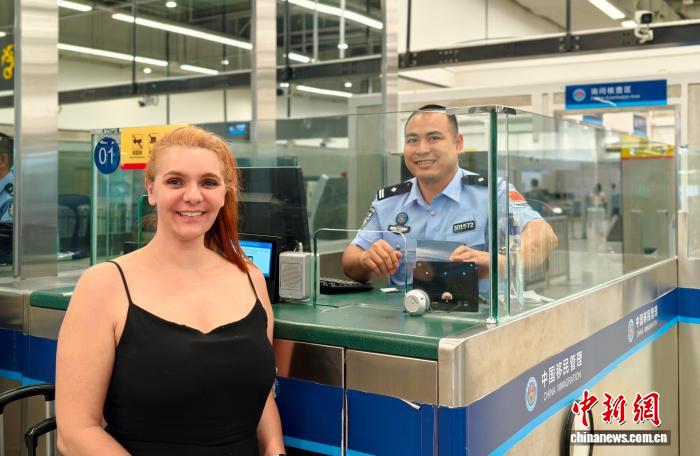 享受免签来华参加广交会的巴西客商罗伯塔·佐格比·曼尼点赞皇岗边检站移民管理警察高效服务后要求合影。皇岗边检站供图