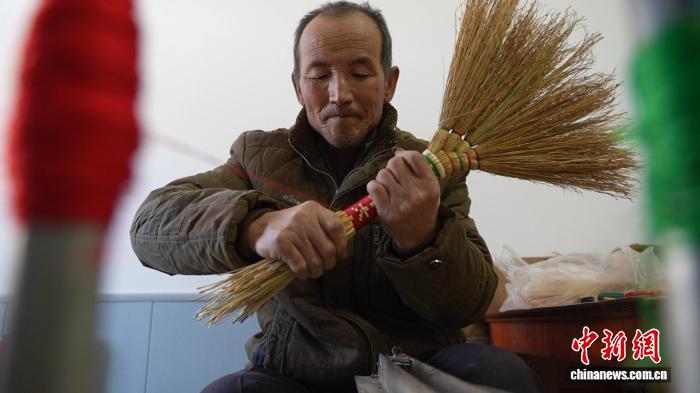中新网兰州4月16日电 (杨蕊)“纯手工活儿,边做边卖,这个季度收入已近8000元,现在剩下不到一百把笤帚了。”甘肃庆阳市环县手艺人李相玉最近通宵达旦地整理着高粱苗,“五一”快到了,他得加紧再做一些笤帚。