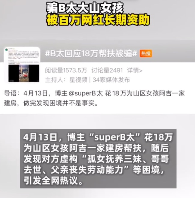 4月13日,博主@superB太花18万为山区女孩阿吉一家建房帮扶,随后发现对方虚构“孤女抚养三妹、哥哥去世、父亲丧失劳动能力”等困境,引发全网热议。据悉,另一百万博主“澳门老炮”也曾帮扶过阿吉一家,为其建造房子提供资助,并认其中一女孩为干女儿。