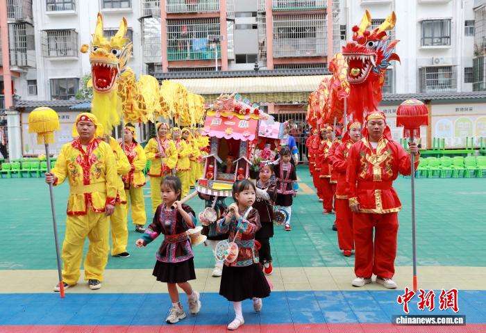 图为在广西三江侗族自治县一所幼儿园里,孩子们在参加“三月三”抢花炮民俗活动。龚普康 摄