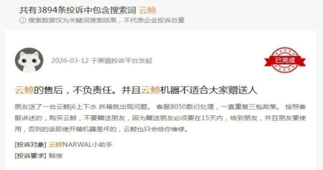 截至2026年4月,黑猫投诉平台上关于云鲸的投诉量接近3900条,投诉内容集中在充电故障、机器报错、拖布模块故障、售后响应慢等基础品控问题。