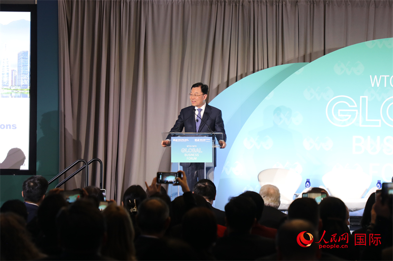 4月20日,中国驻美国大使谢锋应邀出席在费城举办的第五十六届世界贸易中心协会全球商业论坛开幕式并发表主旨演讲。人民网记者 李志伟摄