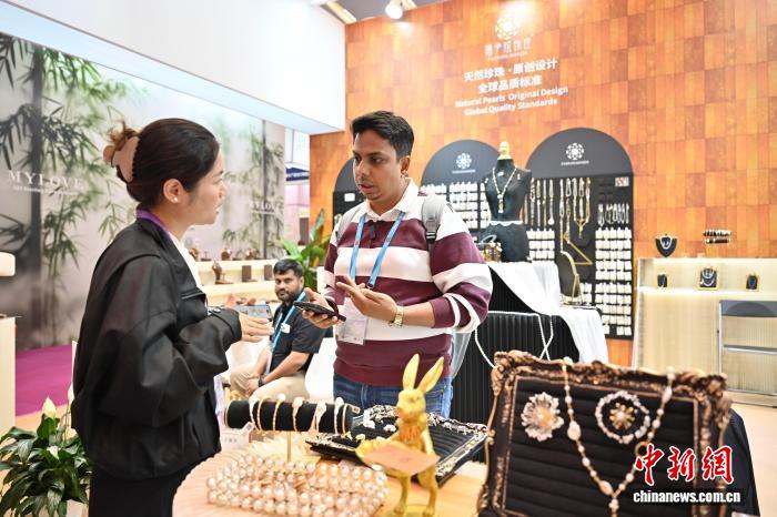 图为境外采购商在时尚饰品专区和参展商洽谈。中新社记者 陈楚红 摄
