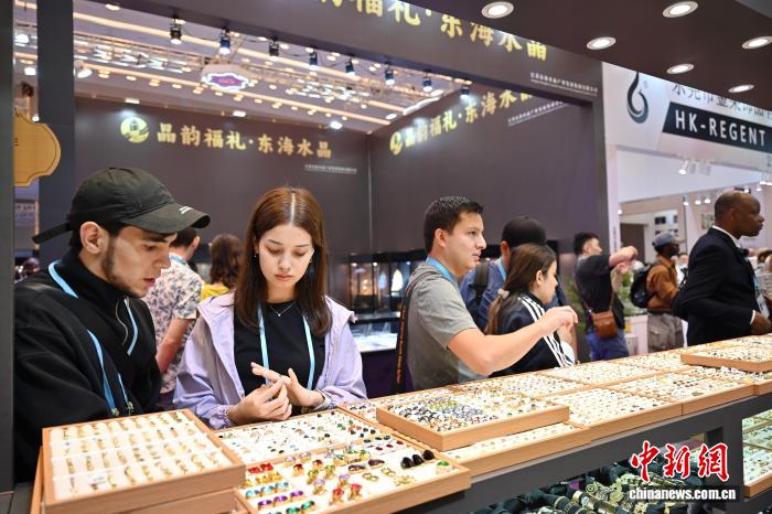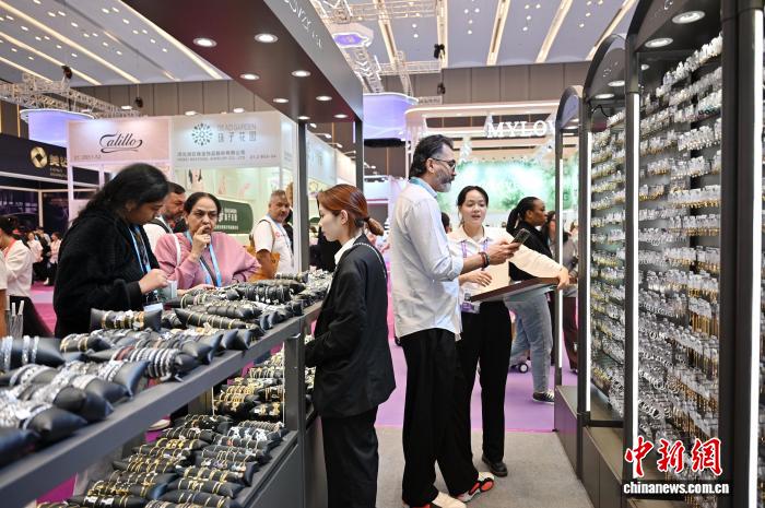 图为时尚饰品专区的饰品吸引境外采购商参观试戴。中新社记者 陈楚红 摄