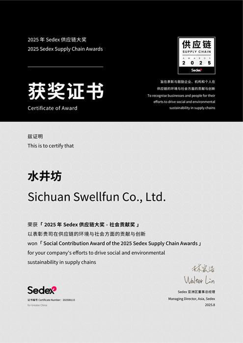 立足产业链协同发展,水井坊将ESG评价嵌入供应商准入与管理体系,并依托Sedex工具对关键供应商开展社会责任评估。同时,公司联合国内龙头企业共同发起“供应链ESG管理倡议(SCSI)”,并深度参与行业标准制定,推动ESG从企业内部管理延伸至全价值链协同。凭借在相关领域的卓越实践,水井坊于2025年荣获Sedex供应链大奖“社会贡献奖”,成为全球唯一获此殊荣的白酒企业。
