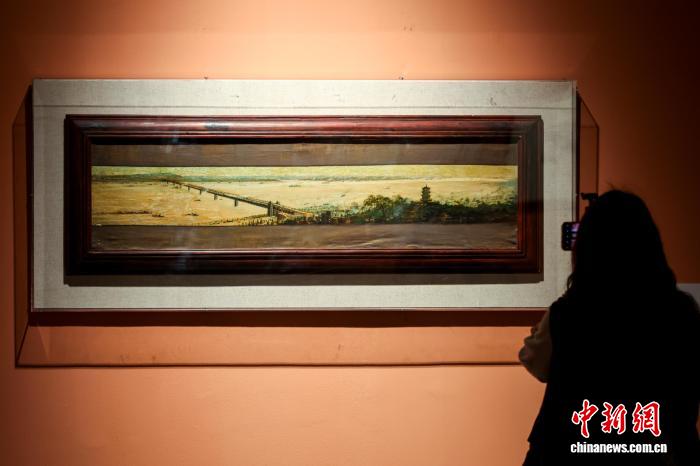 4月1日,湖北武汉,观众参观展出的油画作品《长江大桥》。 中新社记者 张畅 摄