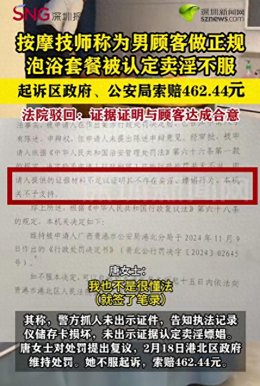 【#女技师做488元按摩套餐被认定卖淫# 起诉被驳回】#女技师被认定涉黄拘留1天后起诉警方# 近日,广西贵港按摩技师唐女士称,去年为顾客做泡浴服务时,被警方以提供涉黄服务拘留一天。次日又遭全身赤裸检查和二次审讯