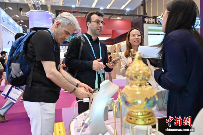 图为境外采购商在时尚饰品专区和参展商洽谈。中新社记者 陈楚红 摄 图为境外采购商在时尚饰品专区和参展商洽谈。中新社记者 陈楚红 摄