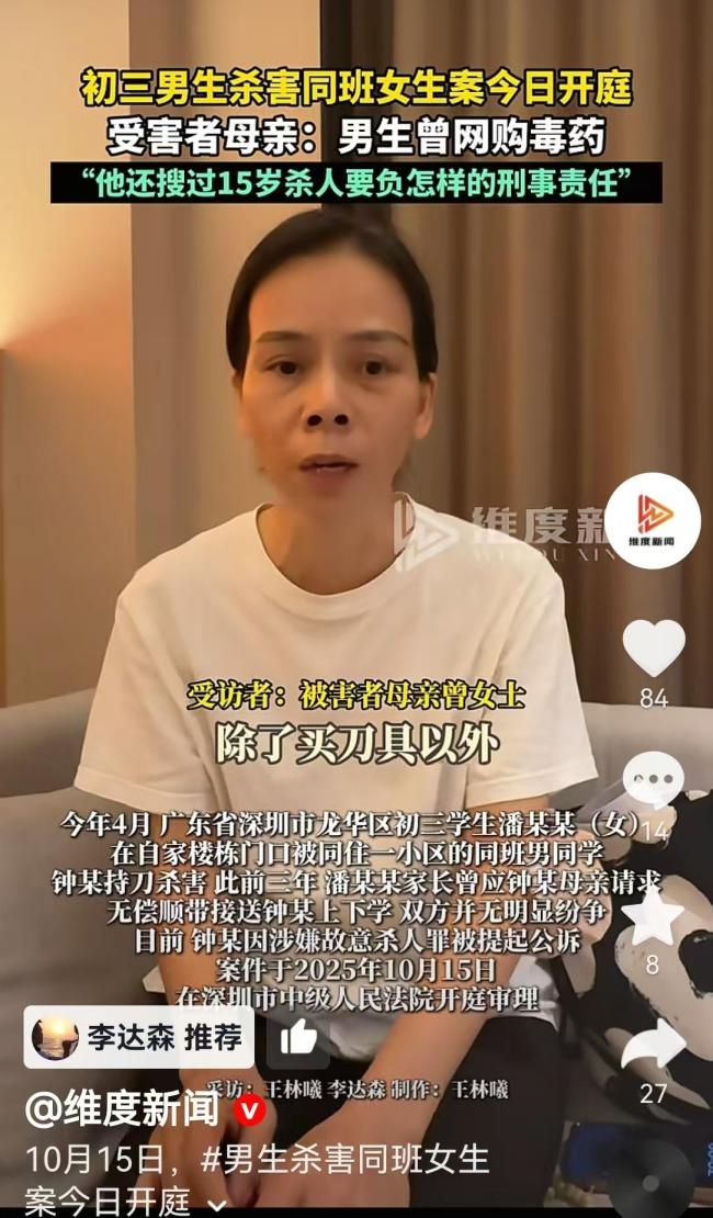 10月15日,深圳一名初三男生因涉嫌杀害同学潘某某的案件开庭审理。庭审前,潘某某的母亲接受了采访,讲述了女儿被杀的大致经过。命案发生在4月份,这名男孩预谋作案,不仅在网上购买了行凶用的刀具,还尝试购买毒药,但由于毒药是管制用品未能成功发货