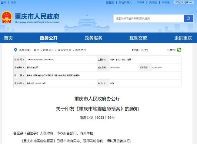 1月5日,重庆市人民政府办公厅发布《重庆市地震应急预案》,旨在健全地震应急机制,依法科学统一、有力有序有效应对地震灾害,最大程度减少人员伤亡和财产损失,维护社会正常秩序