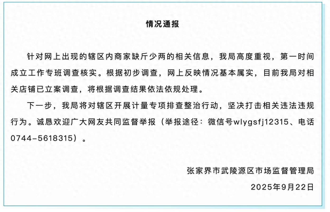5家商铺4家缺斤少两?张家界通报。9月22日,湖南张家界市武陵源区市场监督管理局通报:针对网上出现的辖区内商家缺斤少两的相关信息,我局高度重视,第一时间成立工作专班调查核实。根据初步调查,网上反映情况基本属实,目前我局对相关店铺已立案调查,...