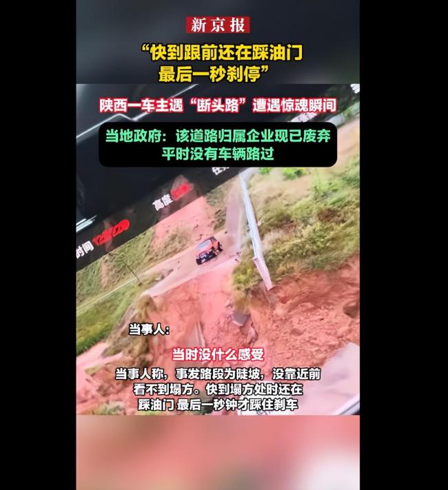 9月21日,陕西一名网民发布视频称,驾车途经清涧县宽州镇时遭遇“断头路”。当事人表示,事发路段为陡坡,未靠近前无法看到前方塌方。快到塌方处时仍在加速,最后一秒才紧急刹车。宽州镇政府工作人员回应称,该道路已废弃,平时没有车辆经过